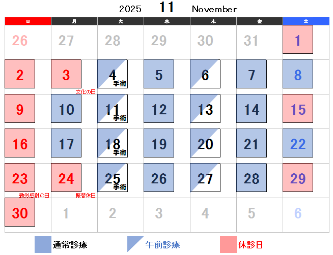 ※ 火曜日午後は手術のため予約診療(診療希望の方はお電話ください。)